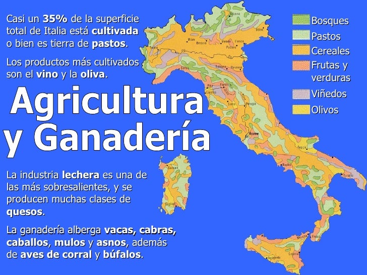 Casi un 35% de la superficie total de Italia está cultivada o bien es tierra de pastos. La actividad agrícola ocupa a un 4% de la mano de obra. La variedad de condiciones climáticas, de suelo y altitud permite el cultivo de diferentes productos. Uno de los cultivos más extendidos es el de la uva, que sitúa al país entre los principales productores de vino del mundo.